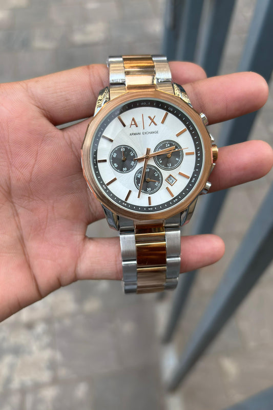 Ar.mani Exchange White Dial Chronograph Two-Tone Metal Belt Watch For Men's